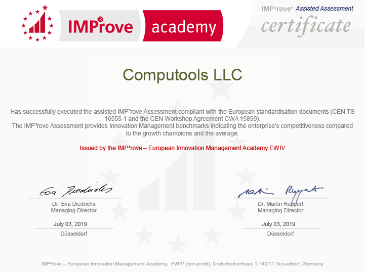 Innovation is the core success factor in the fast-changing business world. It is stated by the European Innovation Management Academy (IMP³rove academy) experts. Recently, Computools has successfully passed the assisted IMP³rove Assessment compliant with the European standardization documents and got an appropriate certificate.
